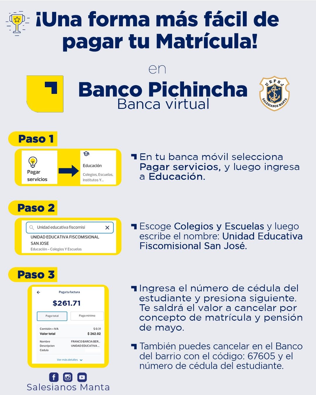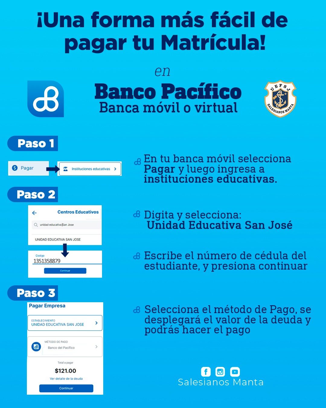 La Unidad Educativa Fiscomisional Salesiana “San José” – Manta pone a disposición diferentes métodos de pago seguros y accesibles para facilitar el proceso de cancelación de matrícula y pensiones.